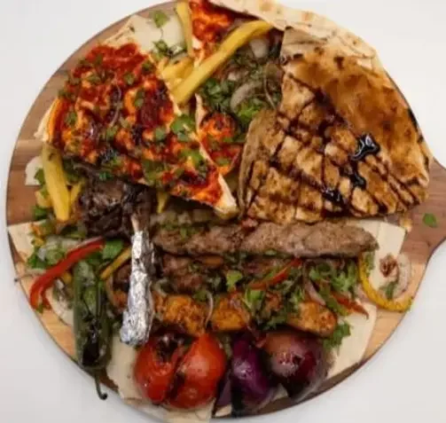 A hearty platter featuring a flavorful mix of grilled favorites — juicy kebab, tender beef tikka, and perfectly marinated chicken taouk. Grilled over charcoal for a smoky aroma and served with all the rich, authentic Middle Eastern flavors.
