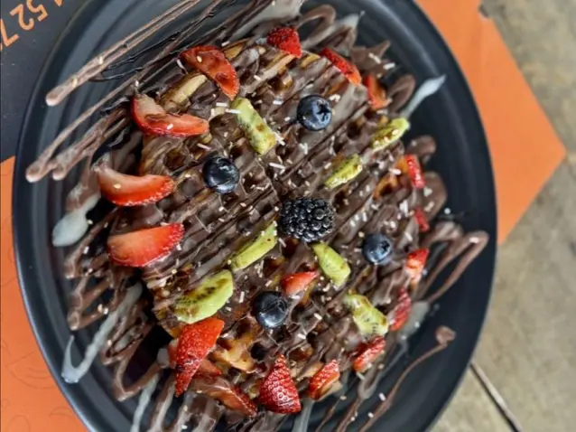 Warm, crispy waffle generously topped with creamy Nutella, fresh fruit slices, and a touch of whipped cream — a rich and indulgent dessert for chocolate lovers