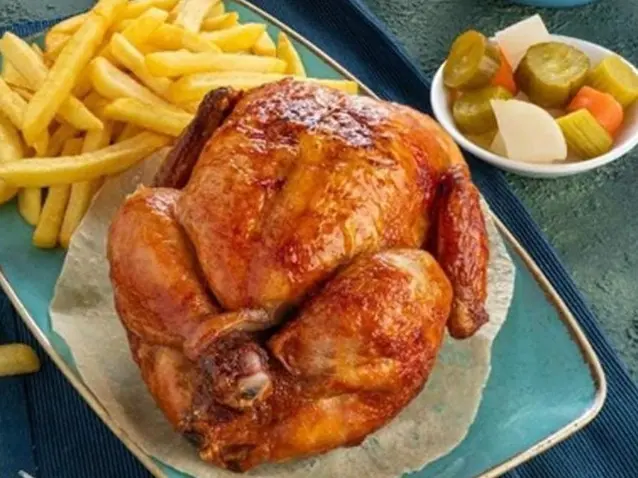 A whole chicken, carefully roasted on the rotisserie machine for a golden, succulent finish. This complete and satisfying meal comes with a rich serving of smooth hummus, a side of our distinctive creamy garlic sauce, and perfectly golden, crispy French fries (potatoes). It’s the ideal meal for a delicious and hearty sharing experience